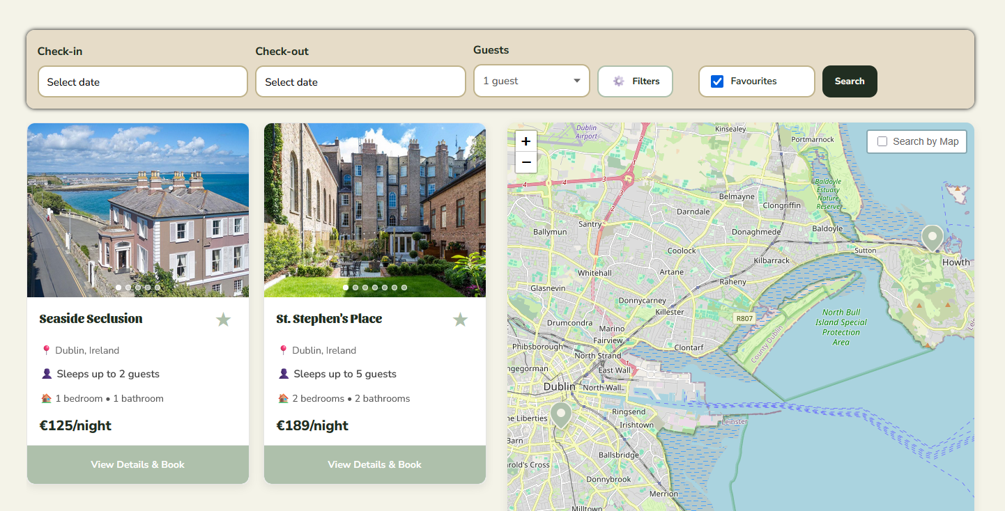 Search for available properties directly from the home page or jump to a property if you already know the name.