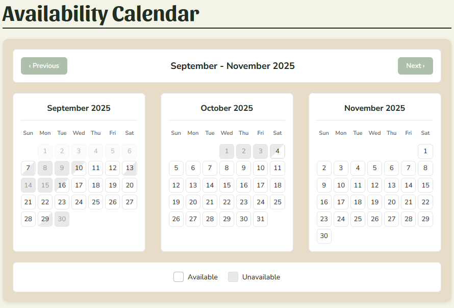 The listing page availability calendar clearly shows booked reservations and allows users to quickly view up to three months of availability at a time.
