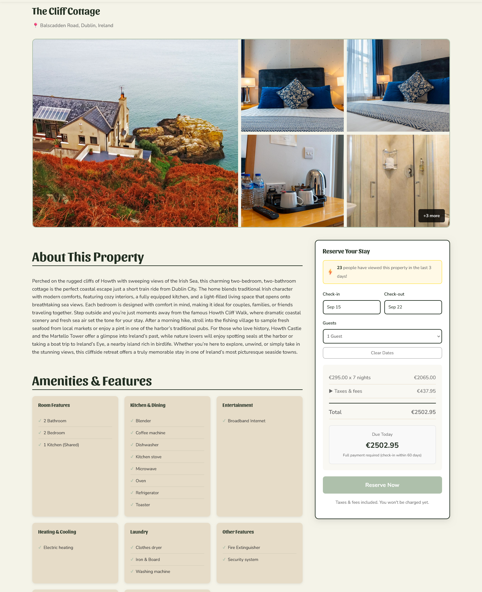 Available rentals appear as modern, gorgeous cards with quick facts, pricing previews, and the property gallery to view — designed to give guests confidence at a glance.